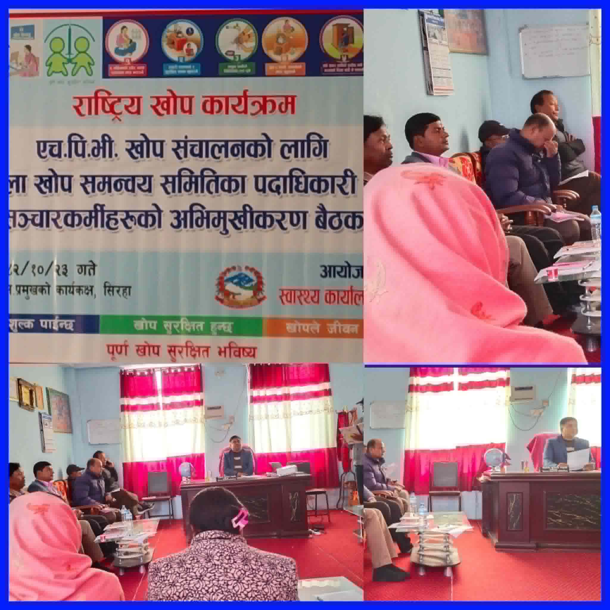 लहान २३ माघ । माघ २३ गते सदरमुकाम सिरहाको स्वास्थ्य कार्यालय सिरहाको आयोजनामा एच. पि. भी. खोप दिने बारे बैठक बसेको थियो । राष्ट्रिय खोप कार्यक्रम अन्तर्गत एच.पि.भी. (ह्युमन प्यापिलोमा भाइरस) खोप सञ्चालन सम्बन्धी जिल्ला खोप समन्वय थप यता