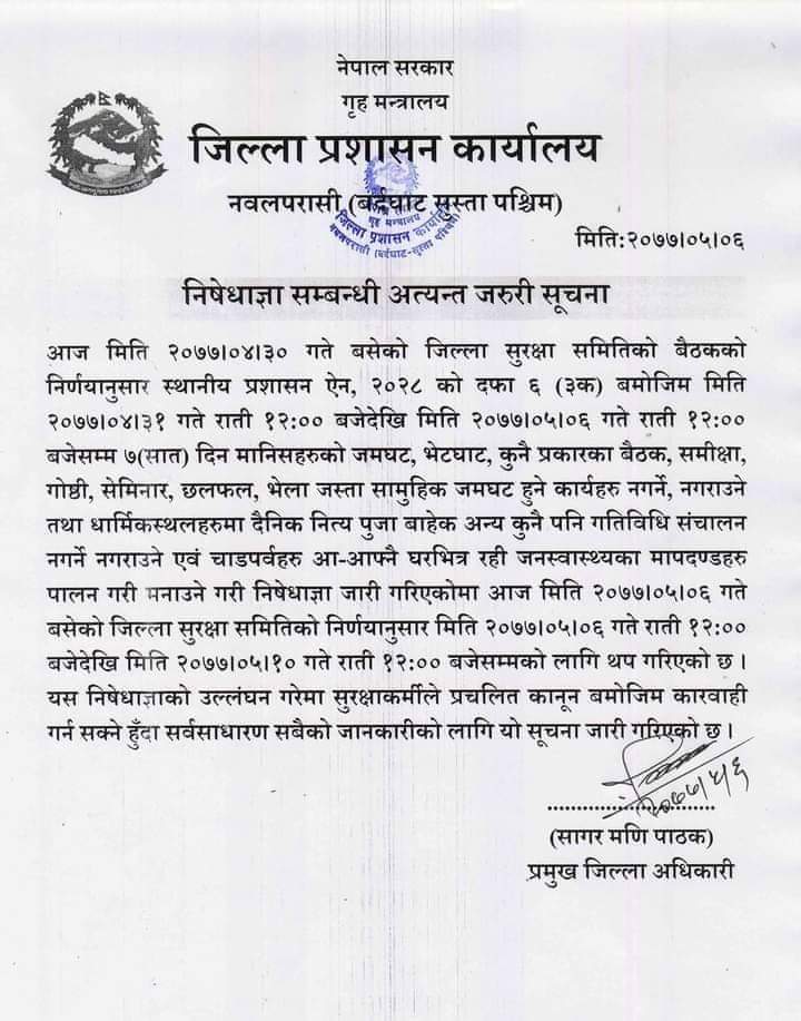 जिल्ला प्रशासन कार्यालय पश्चिम नवलपरासीले भदौ १० गते राति १२ बजे सम्मको लागि पुनः निषेधाज्ञा थप गरेको छ । पछिल्लो समय जिल्लाको बिभिन्न स्थानमा कोरोना भाइरसको संक्रमण फैलिने क्रम बढ्दो अवस्थामा रहेकोले निषेधाज्ञा थप गरीएको हो । आज बसेको जिल्ला सुरक्षा समितिको बैठकले आज राति १२ बजेदेखि भदौ १० गते राति १२ बजेसम्मको लागि पुनः निषेधाज्ञा थप गरिएको प्रमुख जिल्ला अधिकारी सागरमणि पाठकले जानकारी दिए ।